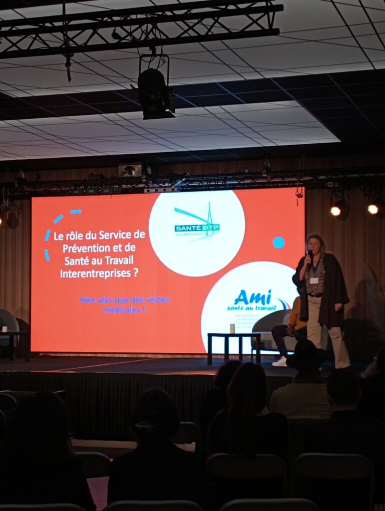 Une équipe de Santé BTP Normandie composée du Docteur AHOWESSO (Médecin du Travail) accompagnée par une Infirmière en Santé au Travail, une Psychologue du Travail, une Chargée de maintien en emploi animaient notre stand.
